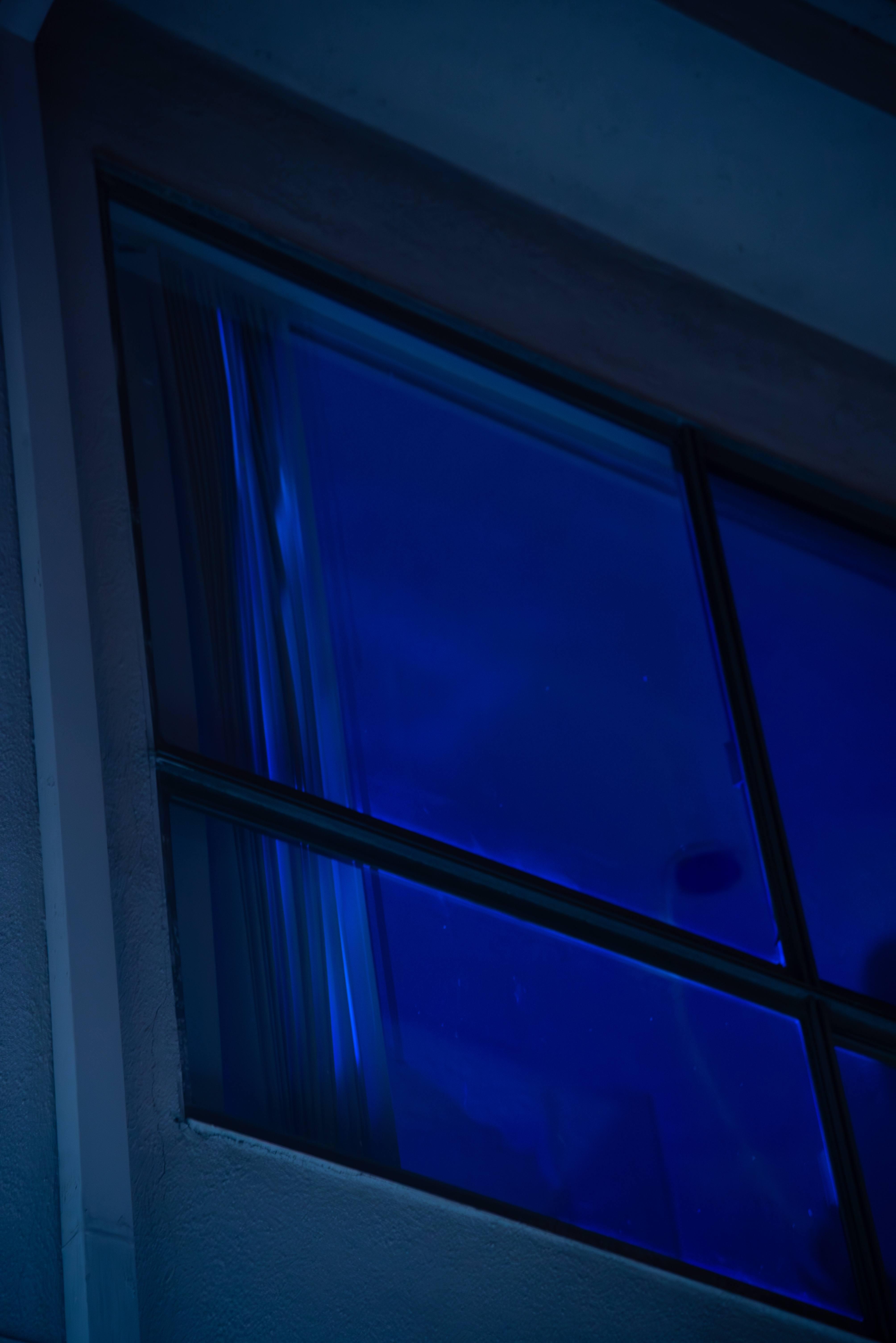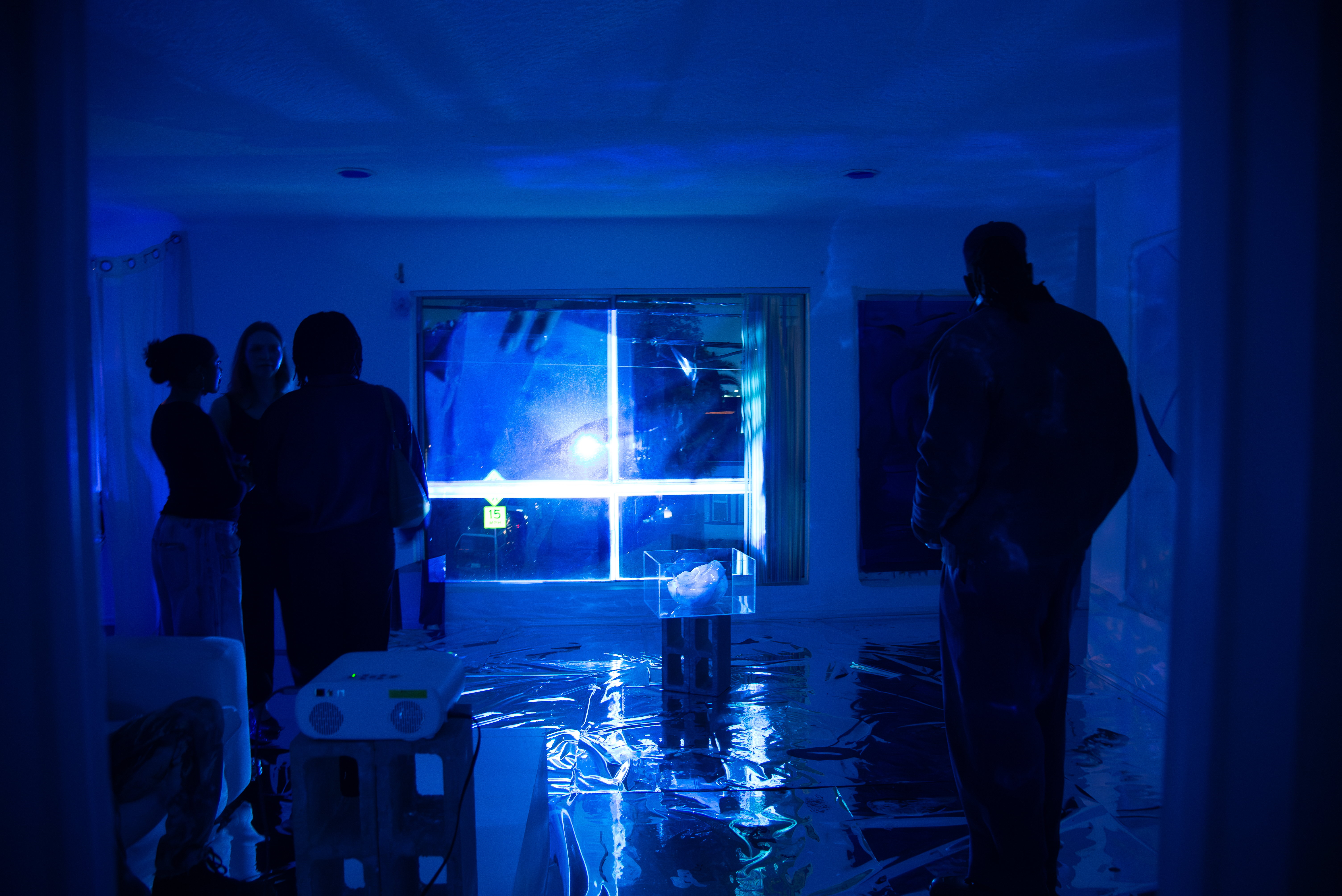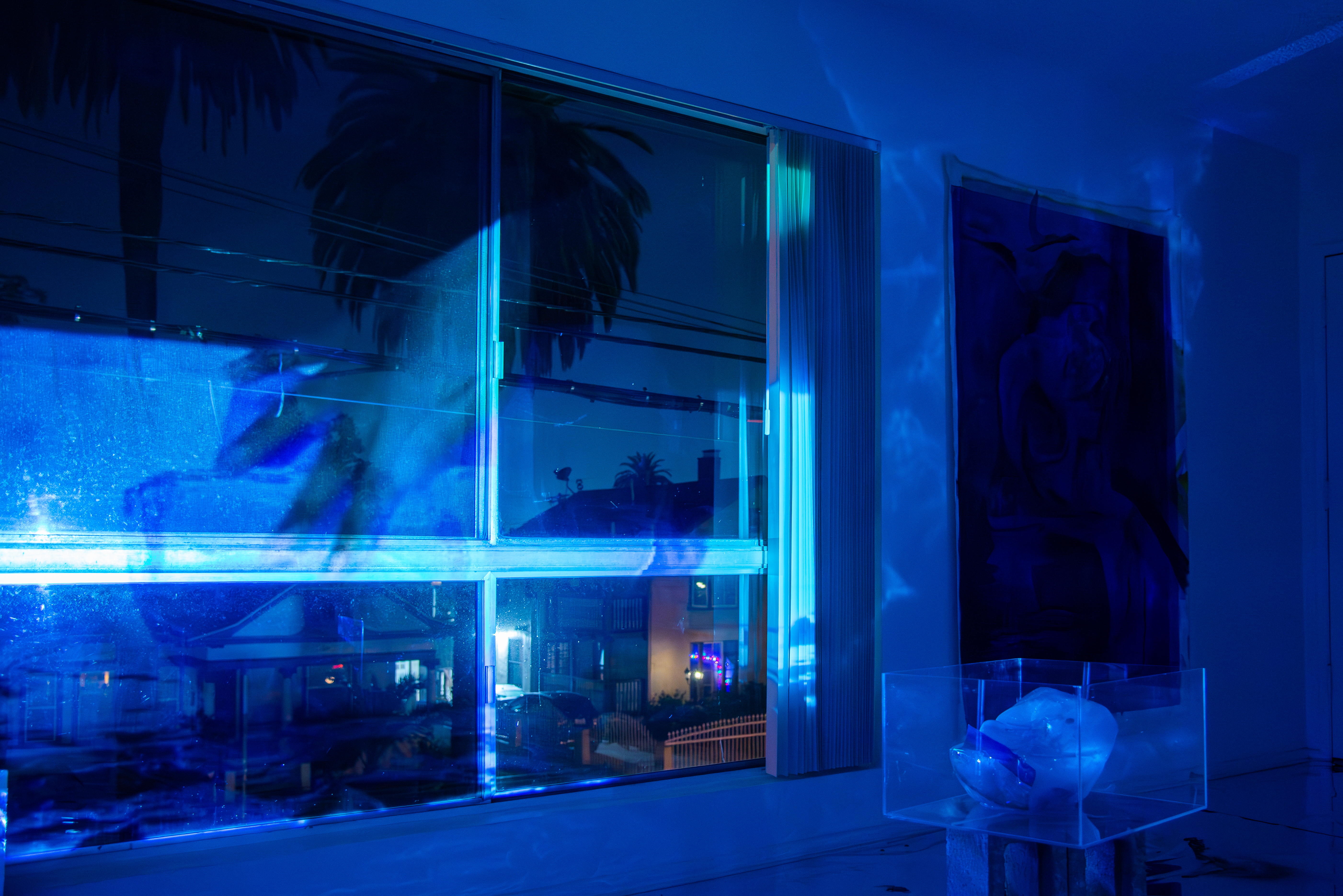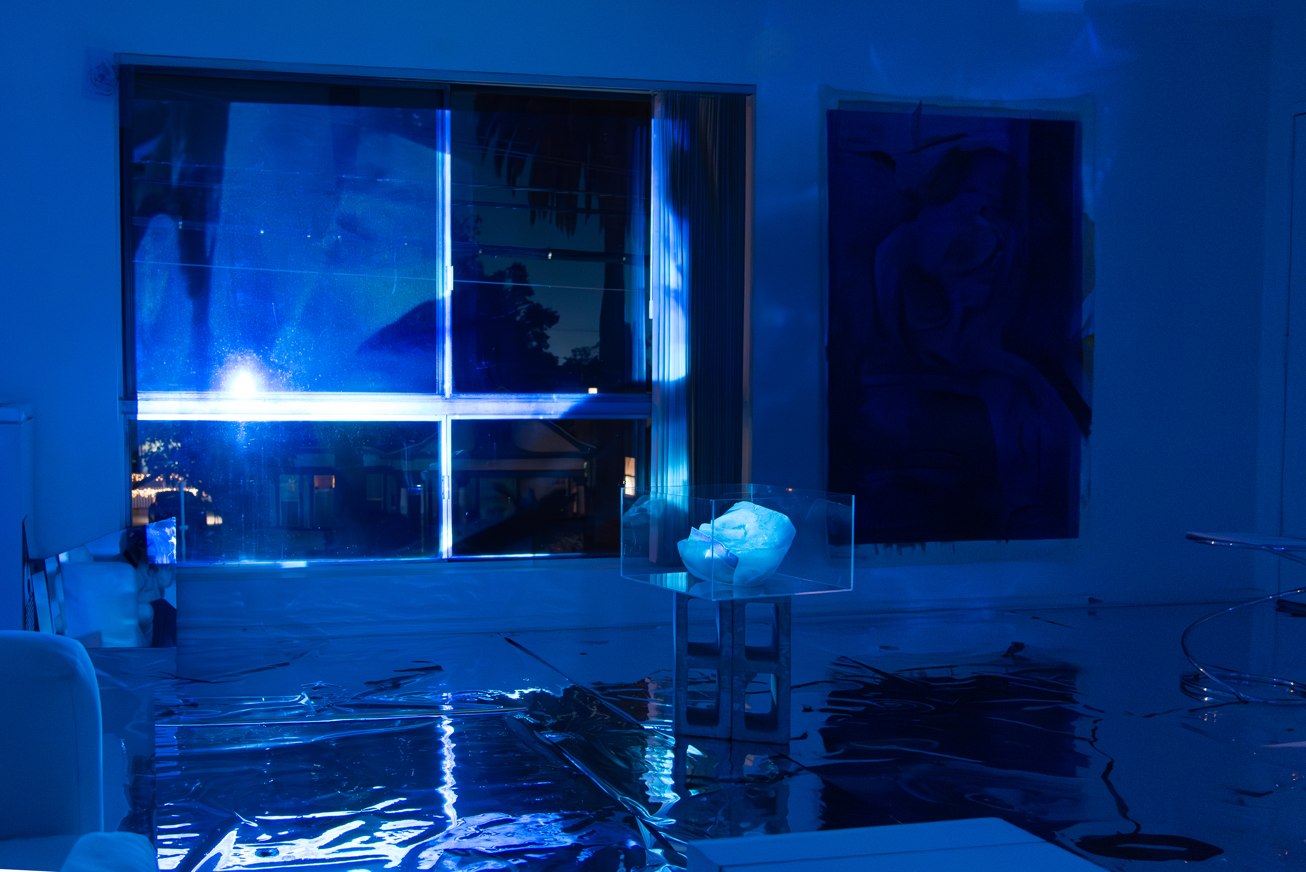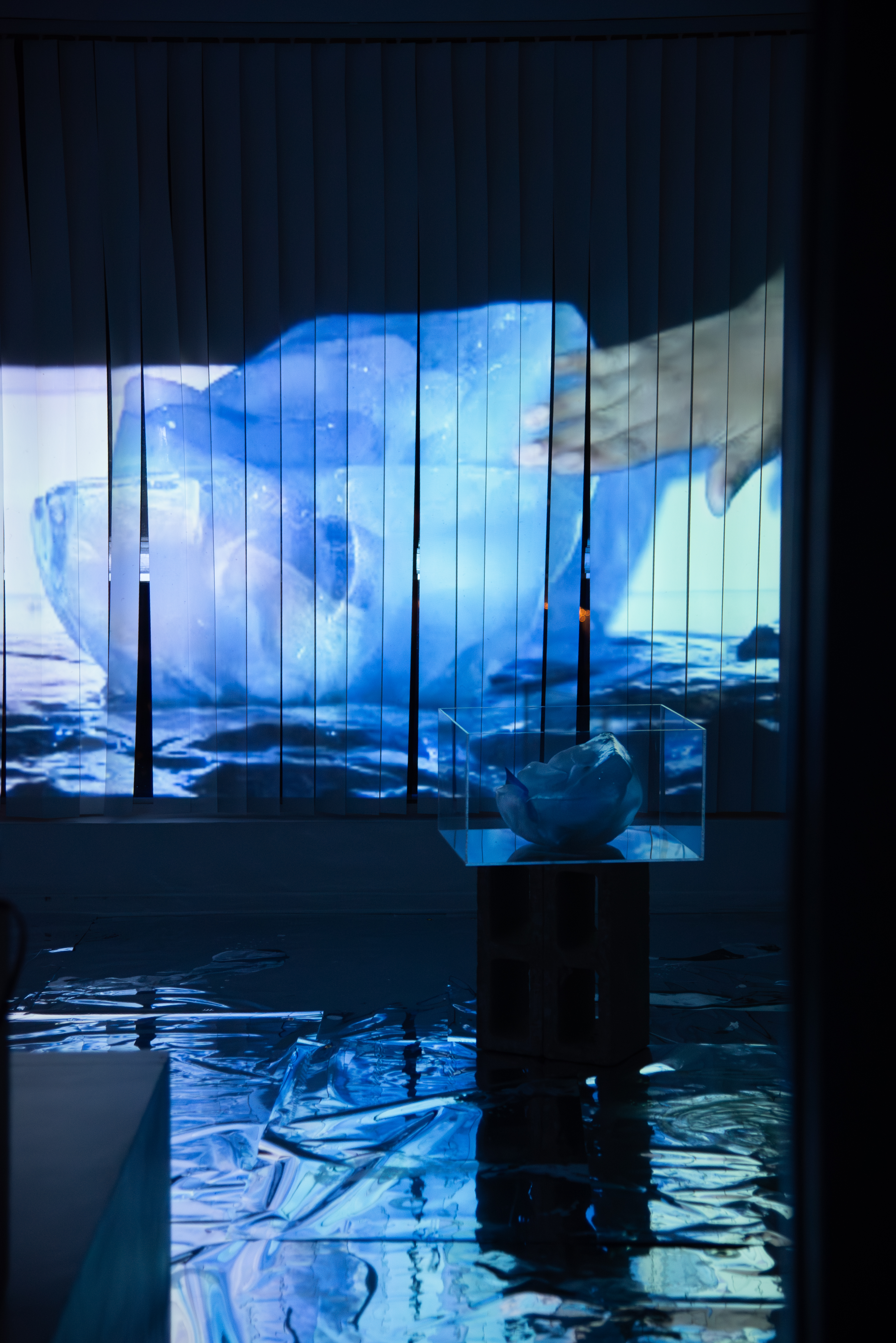 Outside: The video is clear now. In the night air, the viewer can make out the moving blue forms of the video more concretely. Hands on ice: gliding, melting desire. It is the same ice that is melting inside, but now the separation is palpable as the viewer experiences Dreamsicle on the other side of the glass.