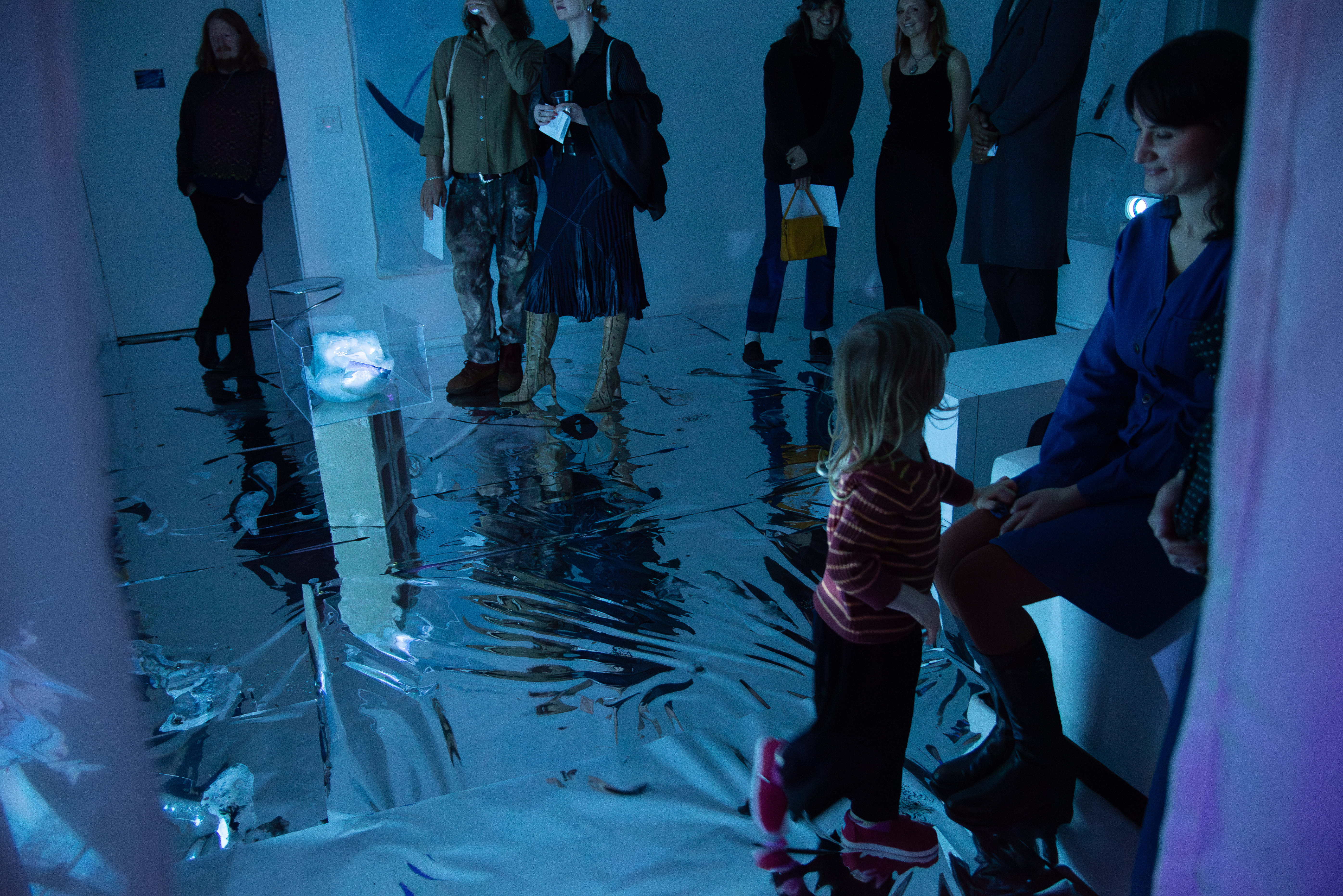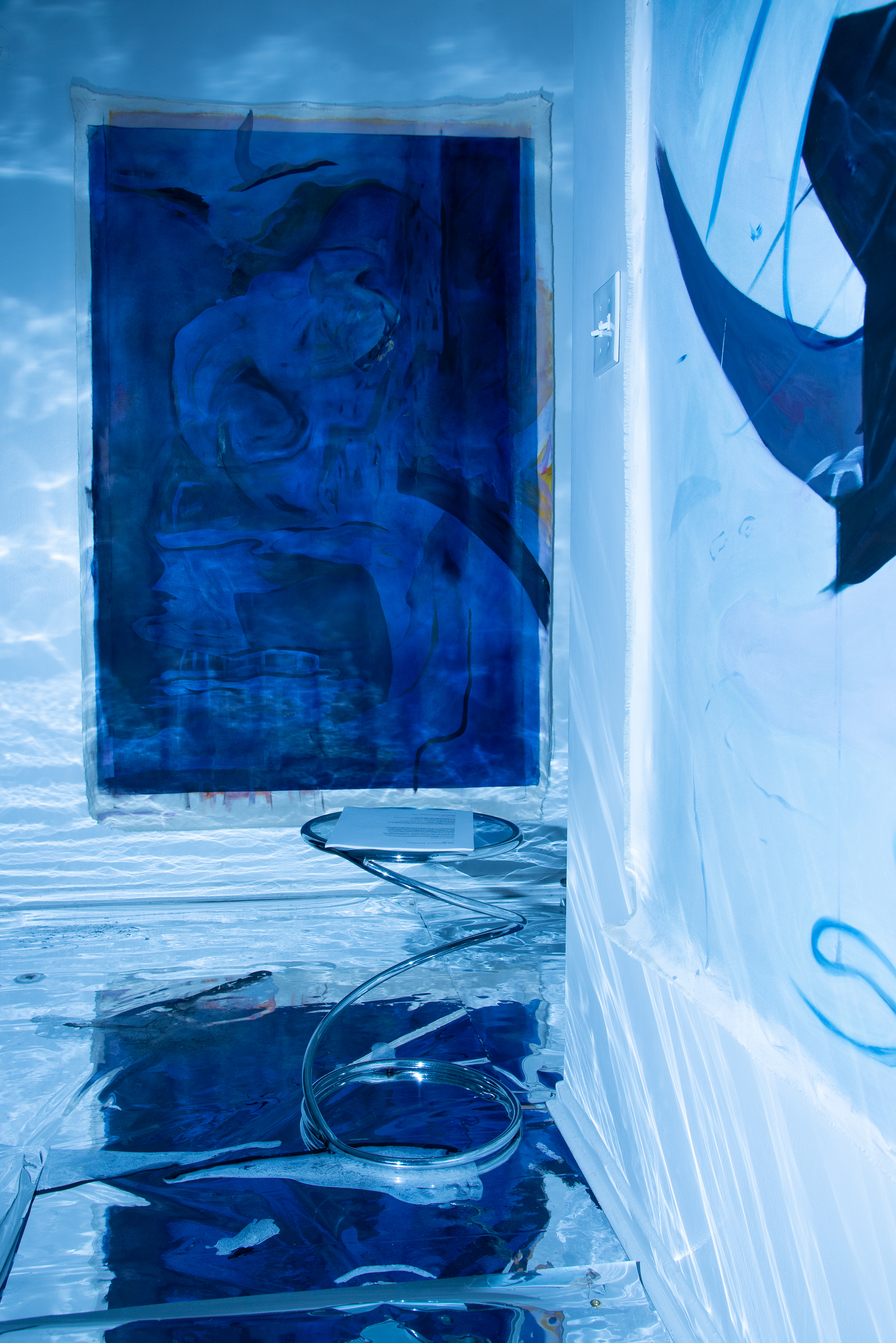 Inside: The video loops across the walls, artworks, and bodies, wrapping itself around the viewer. Inside, Dreamsicle is an abstract dimension where nothing is defined and forms melt into each other, coated in the projected video and its reflections and refractions.